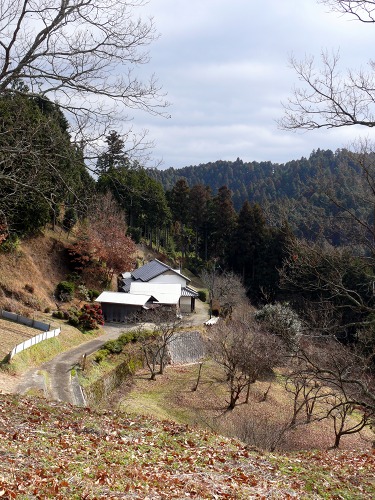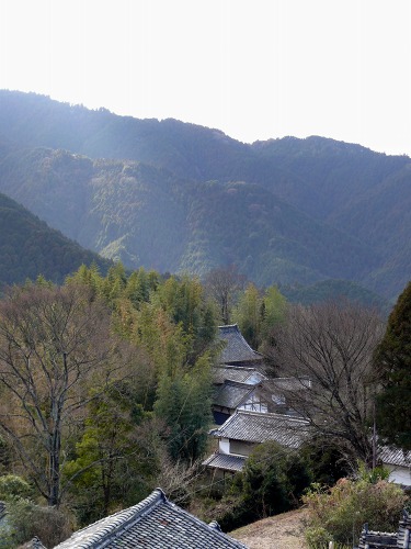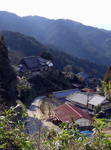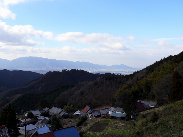 集落の一番高みに在る「大仁保神社」は、絶景です♪ 西は高安山辺りから二上山・葛城山・金剛山が麓の町々と共に大パノラマを見せてくれます。南は、芋峠を挟み、竜在峠へ向かう吉野と飛鳥を隔てる山々が屏風のように広がっています。入谷の集落の様子、遠くこれから向かう栢森の集落、暫らくは寒さも忘れて見入っていました。目を凝らせば、大阪のビル群が見えています。六甲山も空気がもっと清めば見えるのでしょう。
