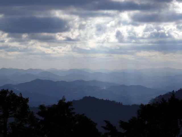再び下り始めます。20~30分も下ったでしょうか、少し開けた所に出ます。この広場状の所の先からは、南に視界が開け、吉野の山々が幾重にも連なり重なるのが見渡せました。