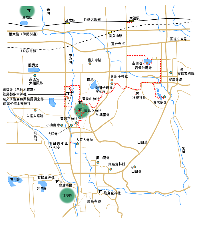 畝傍御陵前駅東口広場 → 本薬師寺跡 → 日高瓦窯所在地遠望 → (藤原宮朱雀大路推定延長線)→ 小山廃寺(紀寺跡) → 法燃寺 → 大官大寺跡 → 奧山廃寺 → 皇太神社横公園(木陰にて昼食) → 飛鳥資料館