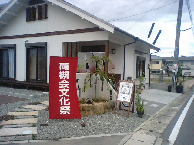 両槻会文化祭の会場「Shop&Gallery 輪-Rin」の正面に「両槻会文化祭」の暖簾が掛かります。